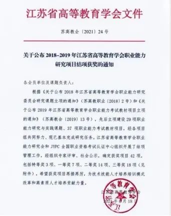 江苏省高等教育学会职业能力研究会和JYPC全国职业资格考试认证中心组织开展了结项管理工作,经组织专家评审、社会公示,确定获奖项目42项,包括特等奖3项、一等奖7项、二等奖14项、三等奖18项